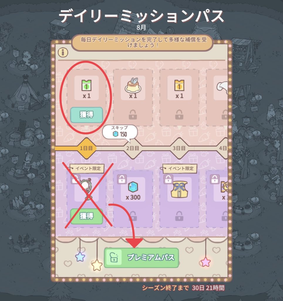 貰えるアイテムは、上の段のみで、下段のアイテムは「プレミアムパス」に課金する必要があります。