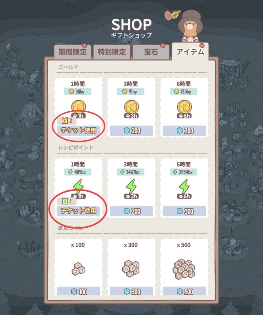 デイリーミッションやイベント等で入手できるゴールド(お金)やレシピポイントが貰えるチケット類。