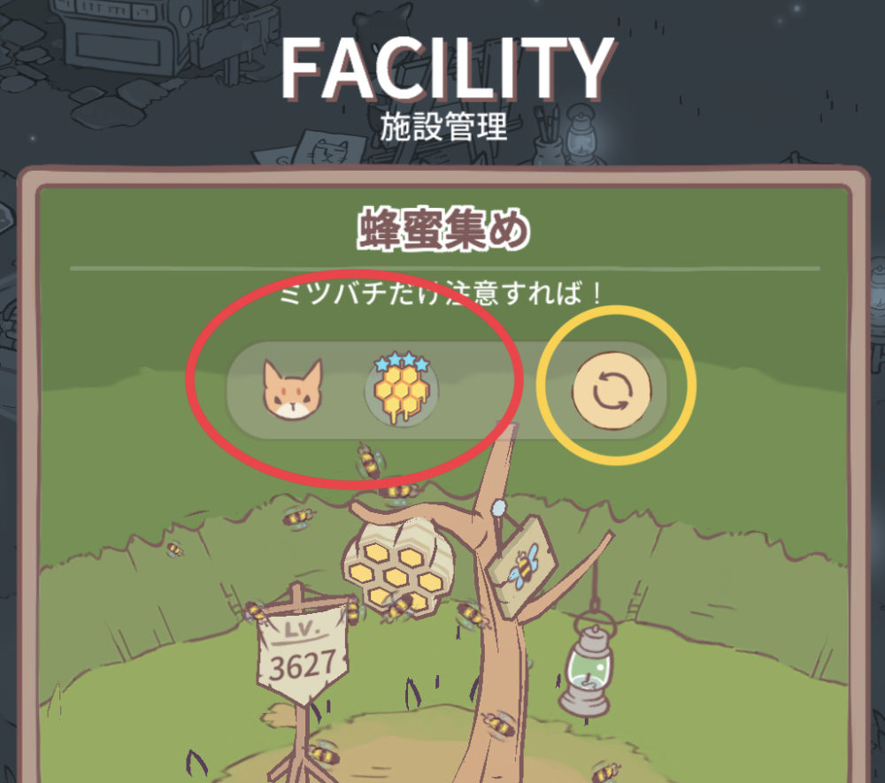 調理施設をタップし、レベルのアイコンをタップ、施設管理の上部にそこで働いている猫と所持しているスキルが表示されています。