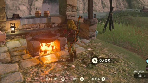 「りょうり」が表示されたら「Aボタン」を押して、素材を料理鍋に入れます。
