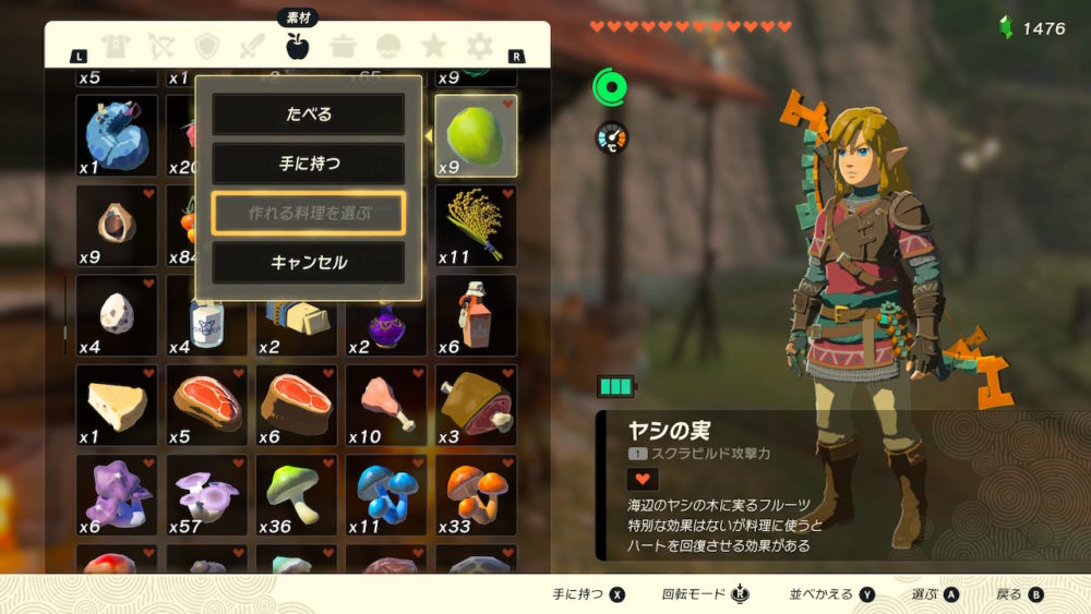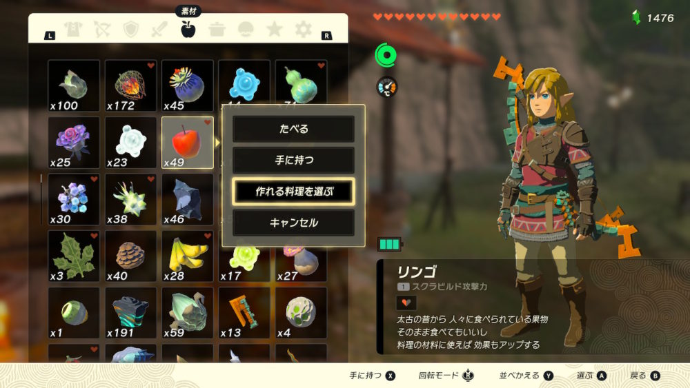 素材を選び「Aボタン」を押すと選択が表示されるので「作れる料理を選ぶ」を選びます。