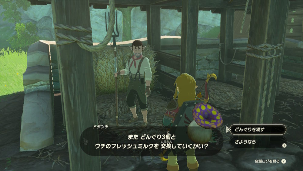 ハテノ村のにある牧場にいる「ドダンツ」に話しかけると発生するミニチャレンジ「こだわりの男ドダンツ」をクリアすると、どんくり3個を持って行くたびにフレッシュミルクと交換して貰えます。